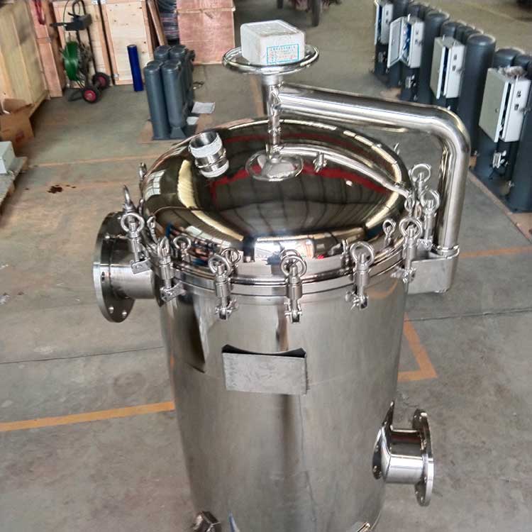 袋式過濾器是一種壓力式過濾裝置,主要有過濾筒體、過濾筒蓋和快開機構、濾袋、加強網等主要部件組成,濾液由過濾機外殼的旁側入口管流入濾袋,濾袋本身是裝置在加強網籃內,液體滲透過所需要細度等級的濾袋即能獲得合格的濾液,雜質顆粒被濾袋攔截該機更換濾袋十分方便,過濾基本無物料消耗。袋式過濾器具備構造合理、密封性好、流通才能強、操作簡便等諸多長處。尤其是濾袋側漏機率小,能正確地保障過濾精度,并能快捷地改換濾袋,使得操作成本下降。濾器內外表面采取機械噴砂拋光解決,平均、易清洗。我們知道,袋式過濾器所采取的過濾方法是側進側出的方法,也可以采取側進底出的方法,通過管道中的壓力將過濾液體介質壓入或抽入袋式過濾器桶體,要過濾的液體介質經由電拋光沖孔支持濾藍承托的過濾袋的過濾,發生變化的固液分別到達液體介質被過濾的結果。